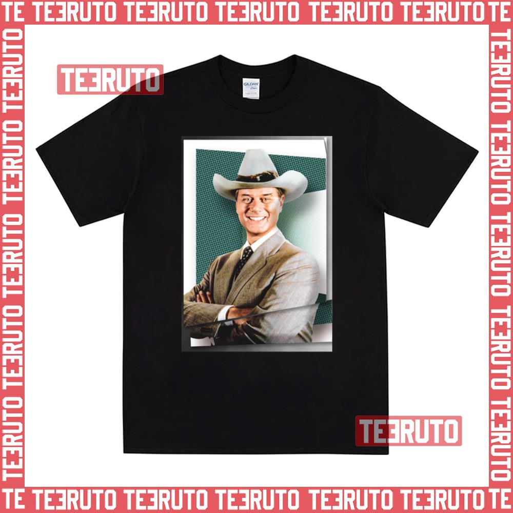 Dallas Jr Ewing Teal Background Graphic Unisex T-Shirt Care Instructions