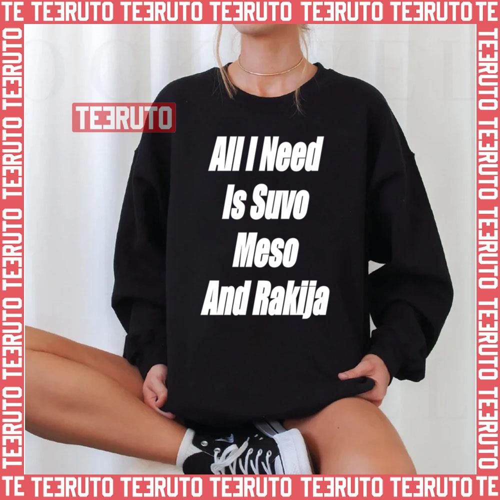 Product detail for White Text All I Need Is Suvo Meso And Rakija Serbian Unisex T-Shirt: